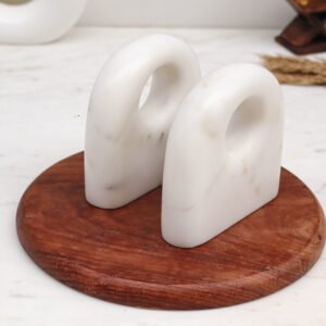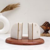 Elevate your literary collection with a touch of mid-century modern flair. These handcrafted bookends feature a sleek, semicircular “D” silhouette carved from pristine white marble and accented with genuine brass inlays. The striking vertical gold-toned line creates a sophisticated geometric contrast, making these stands a radiant addition to any bookshelf or executive desk.