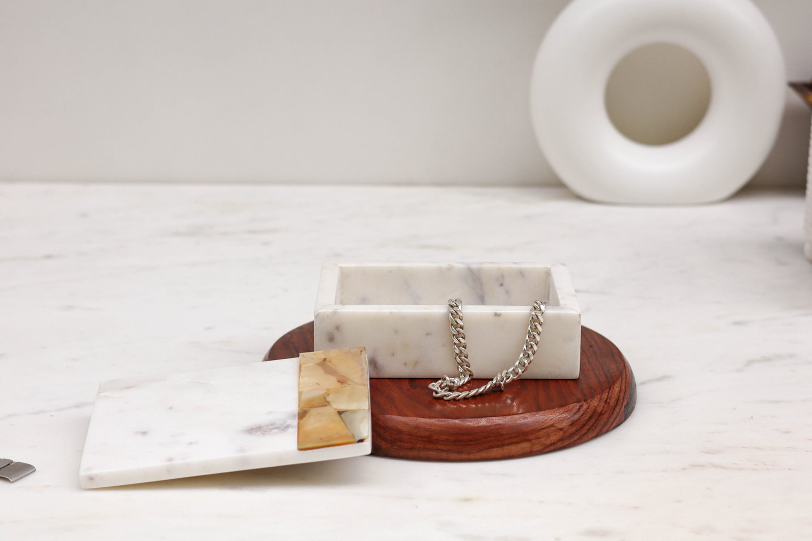 A serene sanctuary for your most precious adornments, the Sea Shall Jewellery Box brings the ethereal beauty of the ocean to your dressing table. Hand-carved from luminous white marble, this elegant vessel is distinguished by a genuine seashell inlay that captures the light with organic, iridescent warmth.