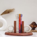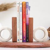 The “Six” Book Stand is a masterclass in mixed-media design, combining the organic warmth of wood with the cool, sculptural elegance of marble. Featuring a unique circular marble motif anchored by sturdy wooden blocks, these bookends serve as a sophisticated architectural statement for any modern library or minimalist workspace.