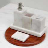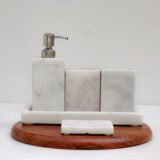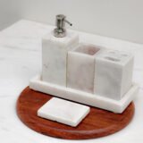 A masterpiece of understated luxury, this handcrafted white marble ensemble brings a crisp, clean elegance to your bathroom sanctuary. Carved from solid natural marble with delicate grey veining, each piece is polished to a satin finish, seamlessly blending classic material with contemporary form.